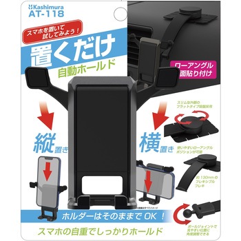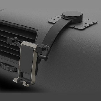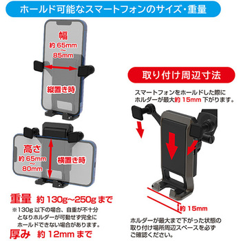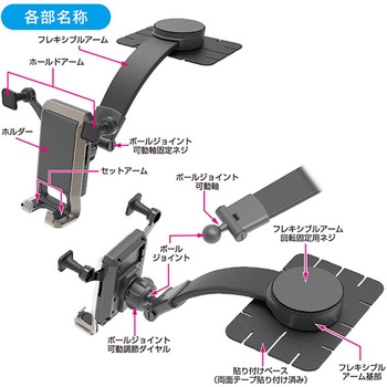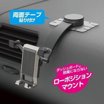 スマホの重さでアームが稼働し、しっかりホールドします。ホルダーはそのままで、縦置き/横置き両方に対応します。設置する場所に合わせて、角度調整が可能。フレキシブルに可動するローマウントフレキ採用。台座は両面テープ取り付け。ガンメタ調塗装の装飾で高級感を演出します。