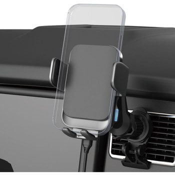 最大対応15W ワイヤレス充電。スマートフォンをワイヤレス充電コイルの想定位置へ自動誘導。アームの開閉幅と補助足高さが連動してホールド、ワイヤレス充電想定位置へ導きます。金属フックでエアコンルーバーへしっかり固定&ロングアームで位置調整自在。ワイヤレス充電ON/OFF切り替え機能付き。フルストアルマイト調メタリックグレー仕上げ。
