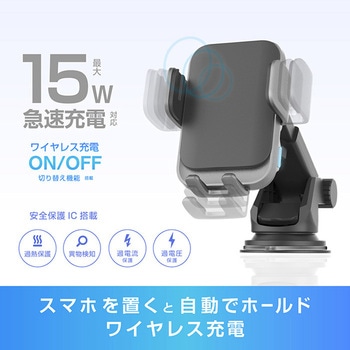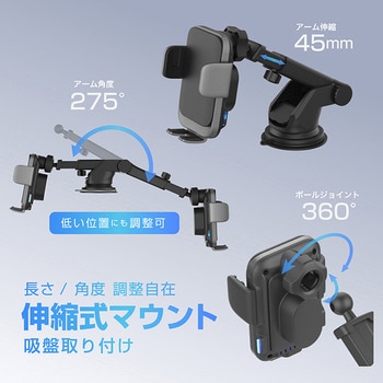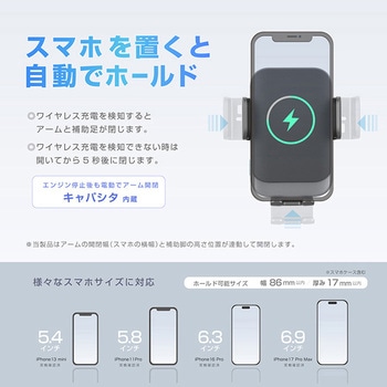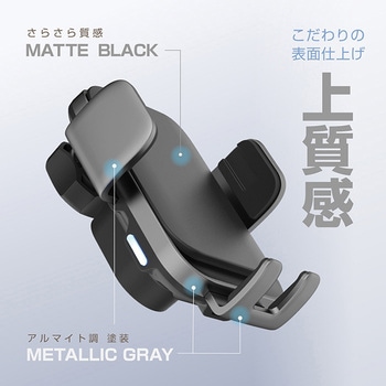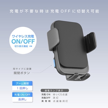 最大対応15W ワイヤレス充電。スマートフォンをワイヤレス充電コイルの想定位置へ自動誘導。アームの開閉幅と補助足高さが連動してホールド、ワイヤレス充電想定位置へ導きます。金属フックでエアコンルーバーへしっかり固定&ロングアームで位置調整自在。ワイヤレス充電ON/OFF切り替え機能付き。フルストアルマイト調メタリックグレー仕上げ。