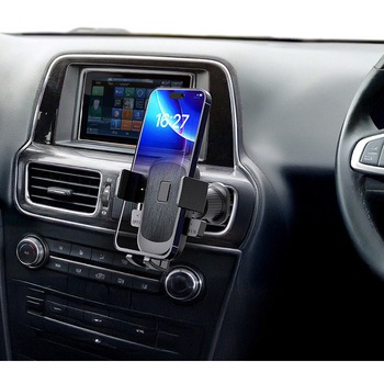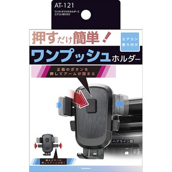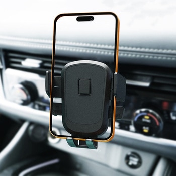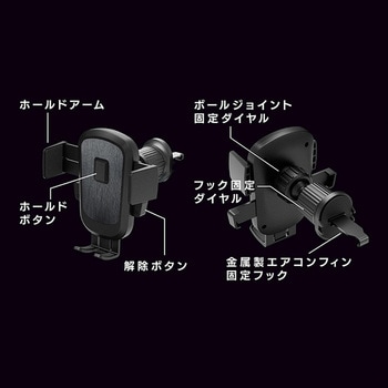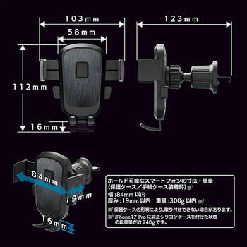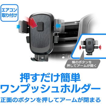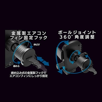ボタンをワンタッチでかんたん開閉ホルダー エアコン取り付けタイプ。ボールジョイントで360°見やすい角度に調整可能。幅84mm・厚み19mmまでのスマートフォンに対応。車内にマッチする黒ヘアライン調デザイン。