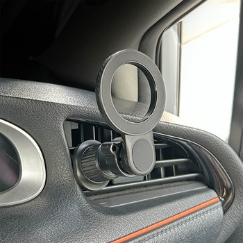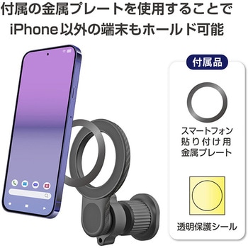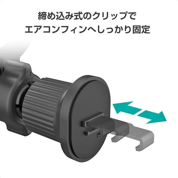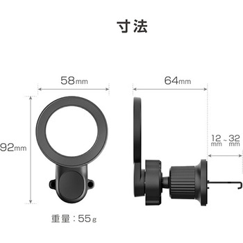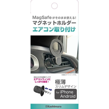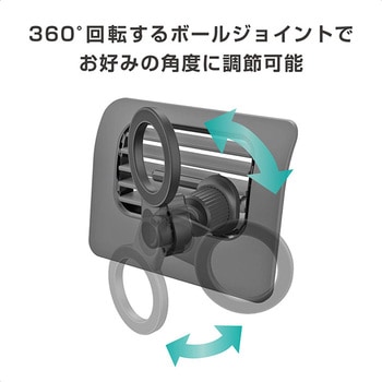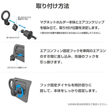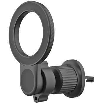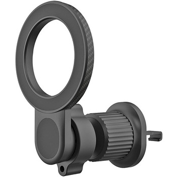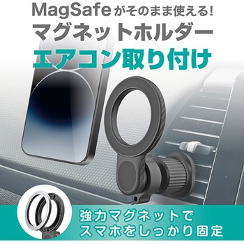 MagSafeがそのまま使えるマグネットホルダー。付属の金属プレートを使用することでiPhone以外の端末もホールド可能。ボールジョイントで360°好みの角度に調節可能。締め込み式のクリップでエアコンルーバーへしっかり固定。