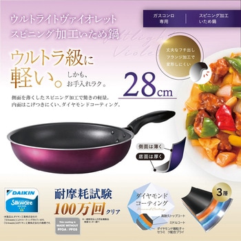ウルトラ級に軽い!側面を薄くしたスピニング加工で驚きの軽量化を実現。内側は焦げ付きにくいダイヤモンドコーティングを施し、焦げ付きにくくお手入れも楽々。丈夫なフチ出しフランジ加工で変形しにくく長くご使用いただけます。調理の量やお好みに応じて選べる22cm~28cmまでのサイズを展開。