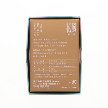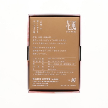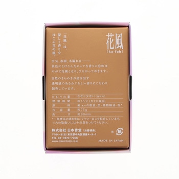 「花風」は優しく香りをはこぶ花の風。空気、水面、木洩れ日。景色にとけこんだピュアな香りの息吹はやがて花風となり、ひろがってゆきます。自然のきらめきが紡ぎ出す、透明感のあるかぐわしい香りにこだわり創り上げたお線香です。