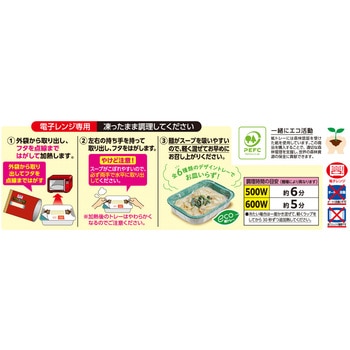 加熱後は熱くなったトレーや蒸気によるやけどにご注意ください。外装はアルミを使用していますので電子レンジで加熱すると発火する危険があります。保存の仕方によりスパゲッティの一部が白く乾燥して固くなることがあります。一度とけたものを再冷凍すると品質が変化しますのでおやめください。加熱中内フィルムが破裂しないように数カ所に空気穴を開けてあります。