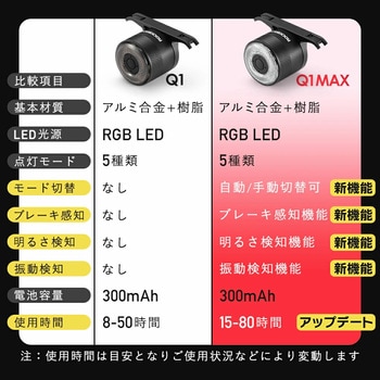 7色発光テールライト「Q1」上位モデル「Q1MAX」は、ブレーキ感知・光&振動センサー・自動点灯/消灯など、スマート機能を多数搭載。周囲の明るさや動きに応じて自動で切り替わる賢い設計で、夜間走行をより安全にサポートします。