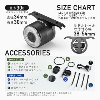 USB充電式で電池交換不要。シートポスト用・サドル用の2種マウントが付属し、愛車や好みに合わせて簡単に取り付け可能です。通勤・通学・ロングライドまで活躍する、高性能スマートテールライトです。