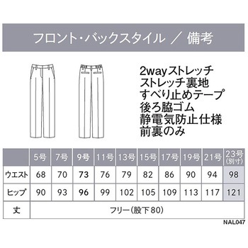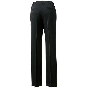 ※スタイリッシュだけではない、アイテムの組み合わせ次第でマニッシュにもフェミニンにも、幅広い印象を表現できる「THE BLACK CLOSET」シリーズ。選べる丈感やシルエットといったデザインをはじめ、機能性や快適さを追求した9つのアイテムでブラックコーディネートの「 新しい常識」を提案。ほどよい生地の厚みと軽さで、4シーズンどんな季節でも快適に過ごせるストレートパンツ。どんな季節にも対応します。静電気を防ぐ機能付き。接客時の「パチッ」を防ぎ、お客様に不快感を与えません。素材には、水や皮脂汚れがつきにくい2wayストレッチの快適素材を使用。2wayストレッチによるストレスフリーな着心地が魅力。ポリエステルの異なる縮みの糸を張り合わせることでストレッチ性を実現。経年劣化の心配がありません。また、一般的に染色加工場の使用廃水は公共の汚水処理施設に送り浄化しますが、環境に配慮し、染色加工場内でバクテリアを使用して汚水を浄化するシステムを採用しています。ハンドマーク防止加工も施しているので、水や皮脂汚れがつきにくく、落ちやすい素材です。