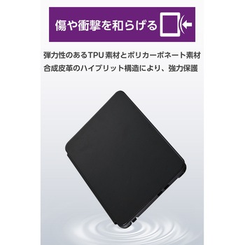 フリーアングルスタンド対応の衝撃に強いフラップケースです。背面スタンドをつかって、角度調節ができます。端末と別売りキーボードをまとめて持ち歩けます。側面に弾力性のあるTPU(熱可塑性ポリウレタン)素材、背面に指紋の付きにくいポリカーボネート素材を使用しています。
