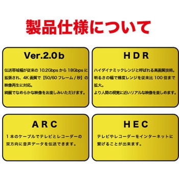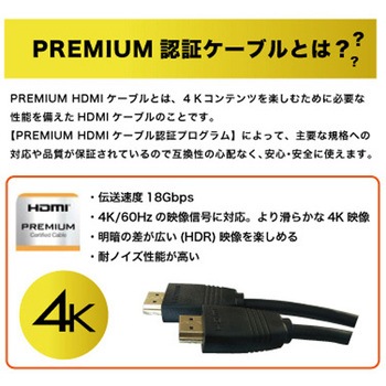 Premium HDMI Cable 規格認証取得済、2K・4K放送対応用になります。(8K放送には対応しておりません) 超高画質映像。音声(伝送速度18Gbps対応)。4K(60P)。4KUHD等に対応。HDR/ARC/HEC対応。マルチチャンネル(サラウンド)音声対応。バージョン2.0b。プラグは金メッキ処理になります。