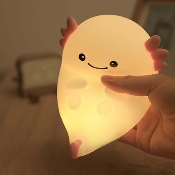 ぷっくりとしたウーパールーパーのキャラクターがやさしく光る、柔らかなシリコン素材でできたタッチ式ライトです。軽く触れるだけで点灯し、シーンに合わせて三段階の明るさや、6色のカラーライトに切り替えられます。就寝前のリラックスタイムやベッドサイドの常夜灯として最適。タイマー機能付きでうっかり消し忘れの心配もありません。USB充電式で約3時間の充電で長く使用可能。優しい光とシンプルな操作性で、毎日の暮らしを快適に彩ります。