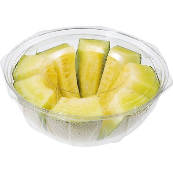 メロンのハーフカット、フラワーカット専用容器の強度と内嵌合で汁漏れしにくいです。