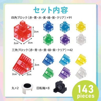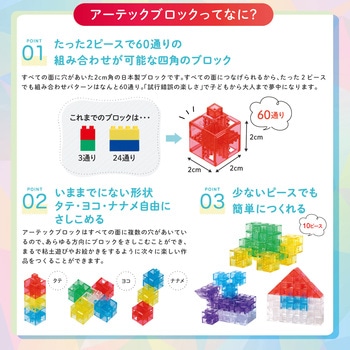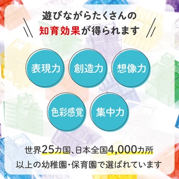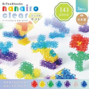 世界25か国、全国4,000か所以上の園で採用されているアーテックブロックのクリアカラーバージョンの「なないろクリア ジュエルギフト」です。たて・よこ・ななめに自由にさしこめ、少ないピースでも多彩な形を作れます。光を透かす透明ブロックが美しく、組み方次第で立体的な作品が簡単に完成。創造力や集中力を伸ばす知育玩具です。【「アーテックブロック」とは】日本で生まれた新しいブロックです。世界25か国、全国4,000か所以上の幼稚園、保育園に採用!2014年にはグッド・トイ賞にも選ばれた安心の日本製ブロックです。子供から大人までずーっと遊べます。すべての面に穴があいた独自構造のブロック。全方向への連結が可能で、小さいお子さまでも、想像した形をどんどん形にしていけます。子供から大人まで、さまざまな遊び方ができる楽しいブロックです。【対象年齢】3歳以上