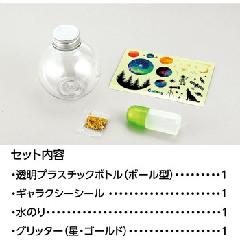 貼って混ぜて完成!簡単に作れるギャラクシースノーボトルキットです。ボトルに水・のり・グリッターを入れるだけで簡単につくれます。宇宙モチーフのギャラクシーシールでデコレーションすれば、自分だけの宇宙が完成。水を着色したり絵を描いたりと自由なアレンジも楽しめます。完成後はインテリアとして飾って楽しめます。短時間で仕上げられるので、イベントやワークショップにもおすすめです。【対象年齢】6歳以上【製作時間】約10分【用意するもの】水、水彩絵の具、割りばし