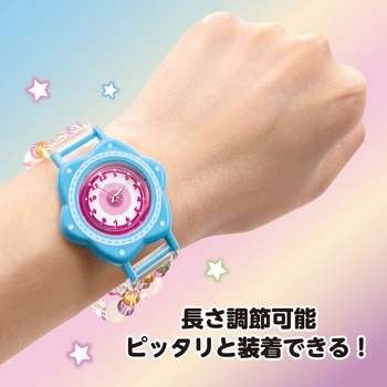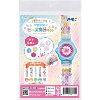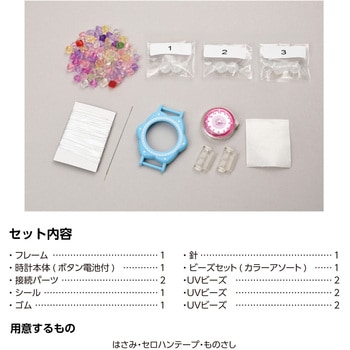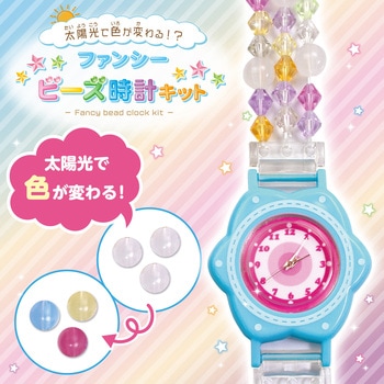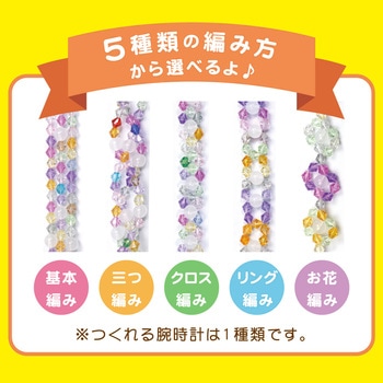太陽光で色が変わる!かわいい腕時計キット!太陽光で色が変わる不思議なビーズを使った、時計づくりが楽しめる工作キットです。基本編み・三つ編み・クロス編み・リング編み・お花編みの5種類の編み方から好きなデザインを選んで、自分だけのオリジナル時計が完成します。かわいくて実用的な作品が作れるので、子どもから大人まで夢中になれるアイテムです。キラキラ光るビーズがかわいく、親子工作やプレゼントにもおすすめです。電池交換可能。【用意するもの】はさみ、セロハンテープ、ものさし