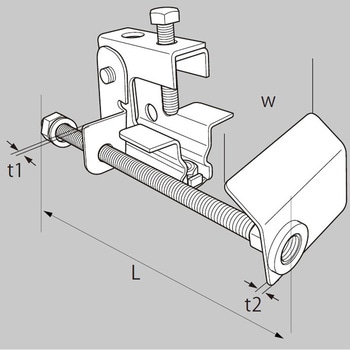 本製品はビューティークランプ(HC26)と補強金具が一体となった金具です。本製品は型鋼から吊りボルトを下げる金具です。