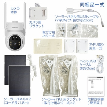 付属品<防犯カメラ>カメラ本体×1、カメラ用ブラケット×1、ソーラーパネル×2 ソーラーパネル用ブラケット(+取付ネジ一式)× 2、USBケーブル×1、ソーラーパネル用USBケーブル(Y字タイプ)×1、取付ネジ(1式)、アタリ取り用紙(1式)、簡易取扱説明書×1