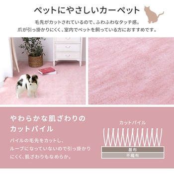 カットパイルでふわふわなめらかな肌触り。毛先がカットされているため引っかかりにくく、室内でペットを飼っているご家庭でも安心です。一から紡績できる強みを生かし、アクリルを2%入れることでまだらミックス感をだし、汚れが目立ちにくいのも嬉しいポイント。敷詰めではなく、ラグとしてもお使いいただけるため、大きいサイズのラグをお探しの方にもおすすめです◎