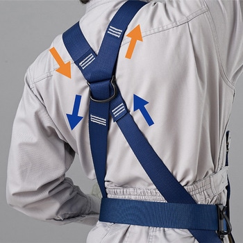 フリーショルダー:方の動きに追随して肩ベルトがスライドするので腕を挙げるなどの動作でも肩がつっぱりにくく快適に作業が可能となります。