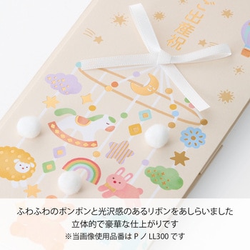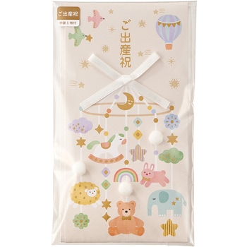 赤ちゃんがご機嫌になる、にぎやかなベッドメリーをモチーフにした出産祝い用のご祝儀袋です。ふわふわのポンポンと光沢感のあるリボンをあしらいました。立体的で豪華な仕上がりです。マットな箔押加工がお祝いの華やかさを演出します。