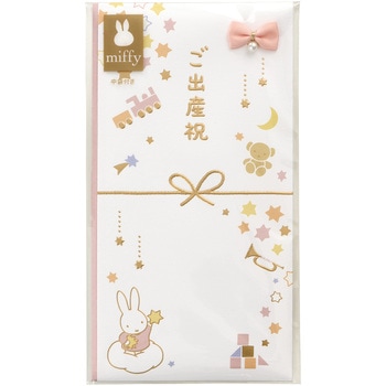 大切なお祝いをミッフィーと一緒に。変わらない人気のミッフィーご出産祝多当に新柄が加わりました。ミッフィーのかわいらしいイラストと箔押しの輝きがお祝いシーンを彩ります。のし部分にはサテンリボンとパールの飾りつき。