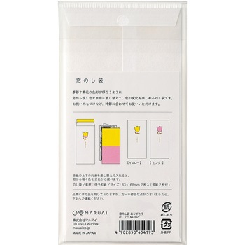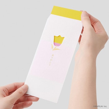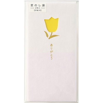 季節や草花の色彩が移ろうように窓から覗く色を自由に差し替えて、色の変化を楽しめるのし袋。表書きの「ありがとう」の言葉に合わせたモチーフを、窓が描くシンプルな「花」のシルエットで表現。お祝いや心づけなど、時節に合わせてお使いいただけます。お札透け防止の添紙はイエロー・ピンクのツートーンカラーのデザインです。添紙の上下の向きを差し替えて入れると、窓から覗く色を2色から選べます。きらりと艶めく箔押しは「日常の特別感」を表現しています。