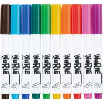 大きいぬりえのNuRIEシリーズ。ヌーリエオリジナルカラーの10色を揃えた、ぬりえにピッタリな隅々まで塗りやすいマーカーです。水性染料インクを使用。