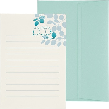 「好きな時間にひらいて 想いを綴る 物語のあるレターシリーズ」本を読む時間「昼」をイメージしたレターセットです。便箋にこぼれる光が行き交う想いを温かく包み込みます。便箋には思いを届ける象徴として鳥(シマエナガ)が描かれています。絵柄に合わせたブルー箔がワンポイントに輝きます。書籍用の紙を便箋に使用しています。「さらっとしためくりやすい紙質」「目に優しい淡いクリーム色」「文字が裏面に透けにくい」特徴があります。封筒は便箋を折らずに入れられます。Lサイズの写真が入る定形郵便サイズです。封筒のフタにはデボス加工のシンプルな装飾が施されています。