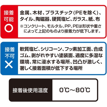 軟質塩ビ、シリコーン、フッ素加工面、合成ゴム、剥がれやすい塗装面、過度に多湿な環境、常に浸水する場所、凹凸が激しく著しく接着面積が低下する場所
