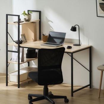 機能充実シンプルなワークデスク。ラックをカスタマイズして作業効率アップ。ラックは左右どちらでも設置可能。アジャスターとクロスバーによりがたつきと横揺れ防止。作業中のストレス減少。メラミン加工だから飲み物を飲みながら作業可能。