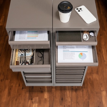 本体/スチール 粉体焼付塗装、引出し/スチロール樹脂、引出し段板/ポリプロピレン
