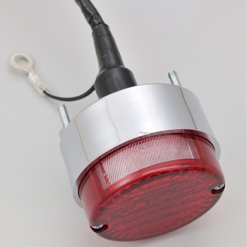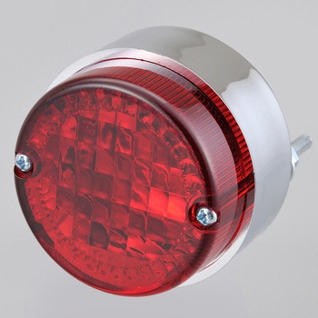 車検に対応した、丸形の小型テールランプ。幅広いカスタムにマッチする形状です。汎用品につき、取り付けには加工が必要。取り付けピッチ49mm、12V21/5W バルブ付属。別売のリフレクターキット(品番:20871、34496)との同時装着が必要です。