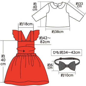 【トップス】400、肩幅:280、腕の長さ:330、スカート:総丈:470(肩紐除く)スカート丈:330 ウエスト:420(伸縮性あり)、蝶ネクタイ:リボン:約60×100、ひも:首まわり約340~420