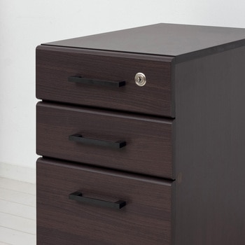 デスクとチェストの使い勝手の良い2点セット。デスク天板の角は丸みがあり小さなお子様のいるご家庭でも安心。デスク背面はクランプ式ライトを取り付けられる加工をしています。チェストはキャスター付きで移動もラクラク、デスク下にも収納可能です。引出しはA4書類が収納でき上段は鍵付きで安心。背面化粧仕上げで美しい仕上がり。