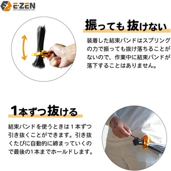 のせて押すだけで結束バンドをワンタッチ装着。装着した結束バンドはスプリングの力で振っても抜け落ちることは無いので、作業中の結束バンドが落下することはありません。結束バンドを使うときは1本ずつ引き抜くことができます。引き抜くたびに自動的にしまっていくので最後の1本までホールドします。