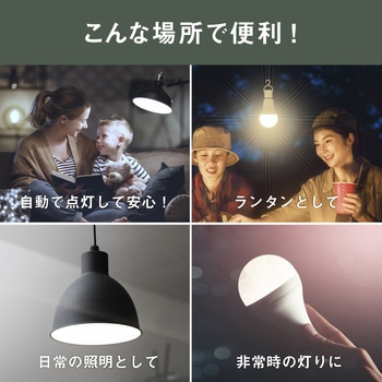 電球に充電池を内蔵し、電球単体でも点灯することができるマルチ電球です。普段は電球として照明器具に取り付けし、停電時や災害時に取り外して充電式のライトとして電球単体で使用することができます。一般的なE26口金の電球と取り換えるだけで使用可能。点灯中に災害などで停電が発生しても、停電を感知して内蔵充電池で自動点灯します。日常は暮らしのあかり、非常時は守るあかりに。