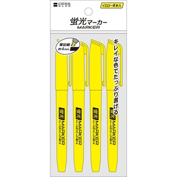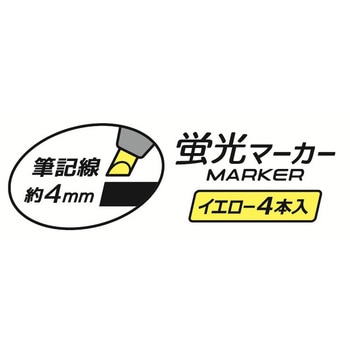 水性インク蛍光ペン4本パック。インク色:イエロー。ペン先形状:ノーマル型。筆記線幅:約4ミリ。
