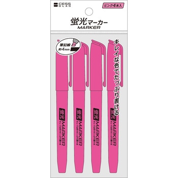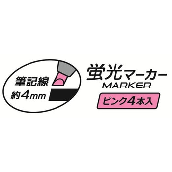 水性インク蛍光ペン4本パック。インク色:ピンク。ペン先形状:ノーマル型。筆記線幅:約4ミリ。