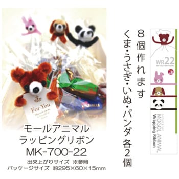 このキットで1セットでモールアートのついたラッピングリボンが8個作れます。(くま、うさぎ、いぬ、パンダ各2個)