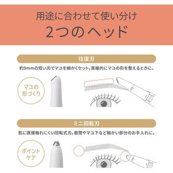小回りのきくヘッドで細やかな微調整が叶う眉用シェーバーポーチにinしたいコンパクトボディ、携帯に便利なキャップ付トリマー刃でマユの形づくり。約9mmの短い刃でマユを細かくセット。直線的にマユの形を整えるときに最適。ミニ回転刃でポイントケア。肌に直接触れにくい回転式刃。眉間やマユ下など細かい部分のお手入れに。アタッチメントのみ水洗いOK、掃除用ブラシ付