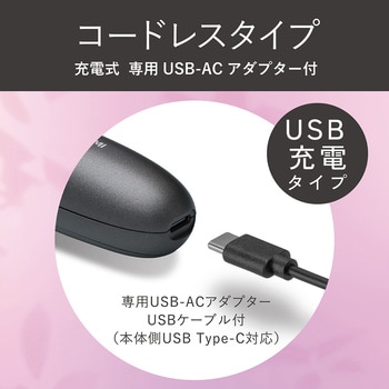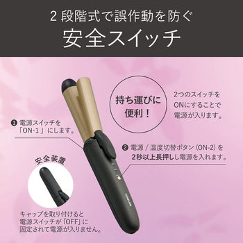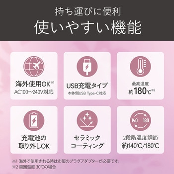 コードレスタイプのカールアイロン(25mm)2段階温度切替え(約140/180℃)、セラミックコーティングパイプ専用USB-ACアダプター、USBケーブル付属。本体側USB Type-C対応海外使用OK、充電池取り外しOK、キャップ付きで旅行にも便利。2段階式で誤作動を防ぐ安全スイッチ