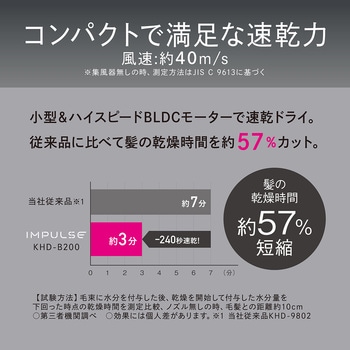 コンパクトで満足な速乾力約10万回転/分のBLDCモーター搭載、パワフルな風を届けます。ハイパワー1200W、マイナスイオン搭載4種類の風(HOT-SCALP-AUTO H/C-COOL)、2段階風量調節(HIGH-LOW)軽量・コンパクト375g取り付けも回転も簡単なマグネット式セットノズル、着脱式フィルター