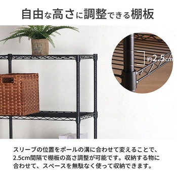 棚板は、約2.5cm間隔で高さ調整が可能。収納する物や用途に合わせて高さの調整ができるので、ラック内のスペースを無駄なく使って収納することができます。