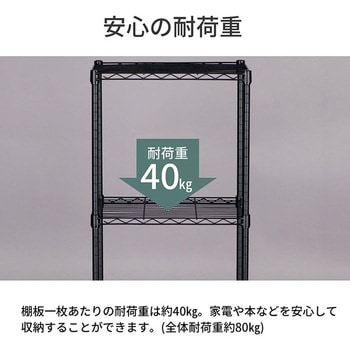 棚板1枚あたりの耐荷重は40kgあり、家電や調理器具、食品なども安心して収納することができます。