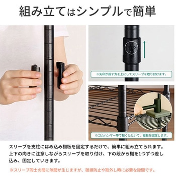 スリーブを柱にはめ込み棚板を固定するだけで、簡単に組み立てられます。使いたい高さの位置で4本の支柱の溝に線を書き込み、上下の向きに注意しながら、線の位置にスリーブを取り付け、下の段から棚を一つずつ差し込み固定していきます。