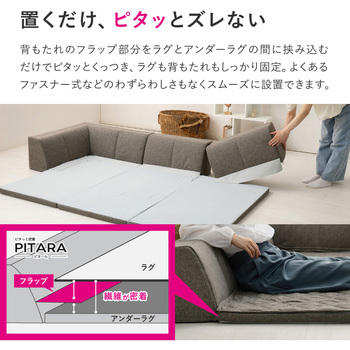 用途「ピターらラグ」は、敷くだけでズレにくい特殊構造を採用したソファラグです。裏面の独自加工により、フローリングに”ピタッ”と吸着し、動いてもめくれにくく快適。さらに「背もたれセット」を使えば、床にラグを敷くだけでソファのような寛ぎ空間をつくることができ、場所を取らずにリビングやワンルームでもすっきりと配置できます。お子様の遊び場やペットとの暮らしにも安心で、カバーは外して洗えるので清潔さをキープできるのも嬉しいポイント。さらりとした肌触りの生地はオールシーズン快適で、使う場所を選びません。カラーはベージュとグレー、サイズは120×180cm・180×180cm・180×240cmの3種類をご用意。ソファがなくても十分にくつろげる”新しいリビングスタイル”を提案するラグです。厚さ‐機能低ホルムアルデヒド内容量1セット