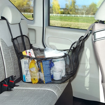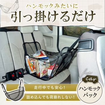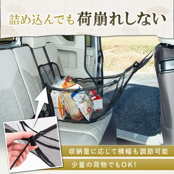 【後部座席に荷物置き場を作れる収納ネット】ヘッドレストに掛けるだけで、車の後部座席に荷物置き場を作れるハンモック型の収納ネット。
