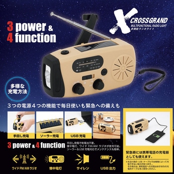 3つの電源、4つの機能で毎日使いも緊急への備えもこれ1台でOKの多機能ラジオライトです。USB充電&ソーラー充電&手回し充電を備えており、非常時には手回し充電で対処可能です。また、緊急時には携帯電話の充電器としても使用可能で安心です。ベッドサイドやリビングなどでの普段使いをオススメします。普段からラジオ視聴や懐中電灯などを使用していただくことで、緊急時に迷わずご使用いただけます。