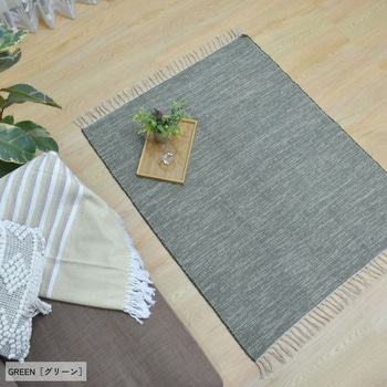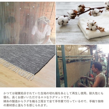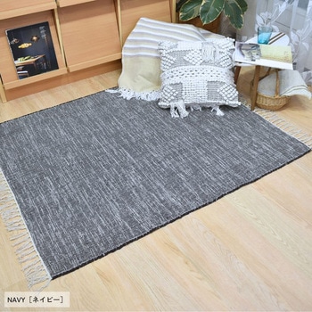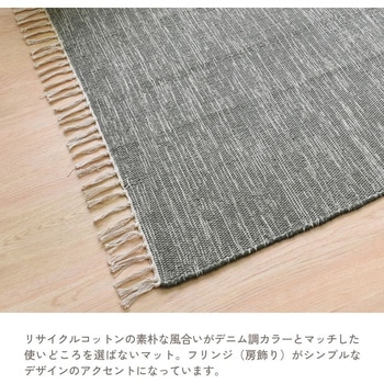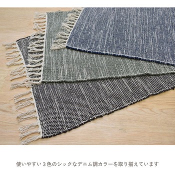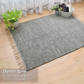 リサイクルコットンの素朴な風合いがデニム調カラーとマッチしたラグです。綿糸の製造からラグを織る工程まで全て手作業で行っているので、手織り独特の素材感と温もりを感じられます。
