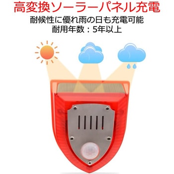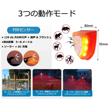 高変換ソーラーパネル搭載、配線の必要なく簡単に設置可能な害獣撃退センサーアラームです。センサー内蔵で対象物が近づくと赤いライトとアラームで害獣を威嚇します。センサー検知範囲は125°、3つのモードを搭載し、必要なモードでご使用いただけます。