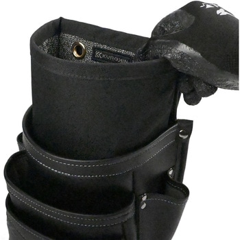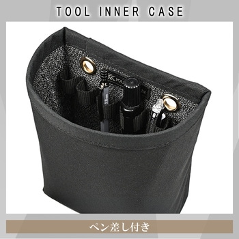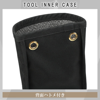 内側に耐切創・耐突刺性に優れた防刃生地を採用。ドライバーやカッターを直接収納しても破れにくく、腰袋の傷みを防ぎ耐久性が向上。内側の防刃生地には、視認性の高いグレーカラーを採用。工具や細かい部材も見やすく、取り出しやすくなることで、現場作業のストレスを軽減。背面にハトメがついているため、カラビナやコードをかけ、簡易腰袋としても使用できる。内側にはペンや検電器など、細身で腰袋内で倒れやすいアイテムを差して収納するベルトポケット付き。